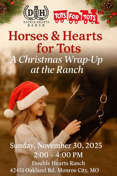 The spirit of the season is coming alive at Double Hearts Ranch! Join us for an afternoon of old-fashioned holiday fun at our annual Horses & Hearts for Tots: A Christmas Wrap-Up at the Ranch — a heartfelt event supporting the Toys for Tots campaign coordinated by Douglass Community Services of Northeast Missouri.